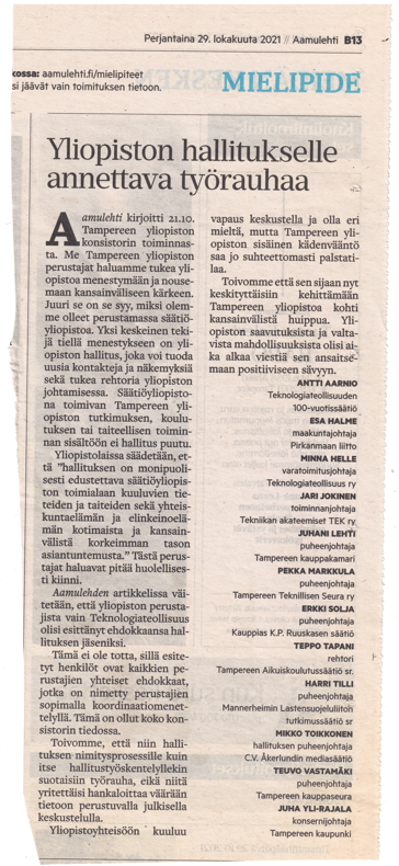 Aamulehti on kaiken aikaa puolustanut yliopistojen yhdistymistä sekä uuden yliopiston hallitusta ja rehtoria. Kun rehtori nyt toukokuun lopussa 2023 joutui lähtemään kesken toimikauden, lehti kiitteli tätä muutosjohtajuudesta vaikeassa tilanteessa. Rehtorin lähtö tietenkin tarkoitti epäluottamusta, mutta tätä vältettiin sanomasta suoraan. Toisaalta rehtorin vaihdolla mahdolliset uuden yliopiston ongelmat voitiin kääntää yhteen henkilöön liittyväksi.